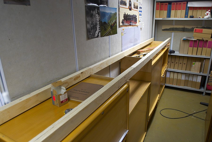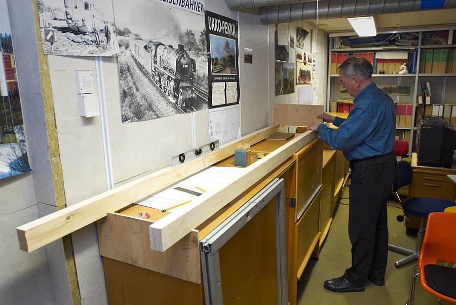Maitomaan aseman runko on päätetty tehdä 40x67 millin kertopuupalkista. Palkit asetettiin arkistokaappien päälle ja kaappien päihin tuiksi ruuvattiin vanerilevyt, joihin oli sahattu sopivankokoinen kolo. Näin ratapiha saadaan vaakatasoon. 2.4.2007 aloitettiin projekti ja saatiin puolet aseman runkopalkeista paikalleen. |