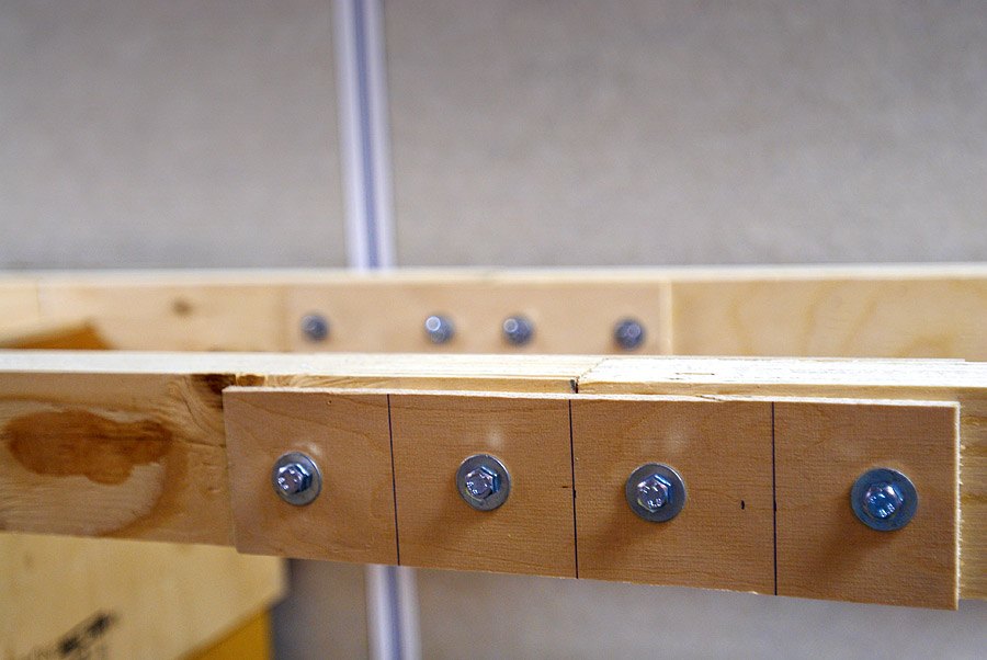 Kertopuupalkit pultattiin toisiinsa vanerisilla "sidekiskoilla" 16.4.