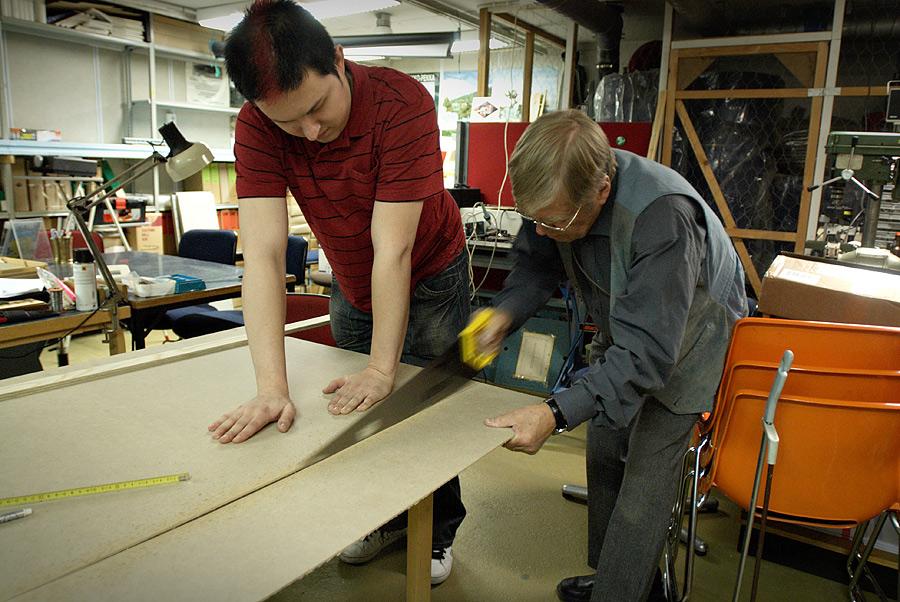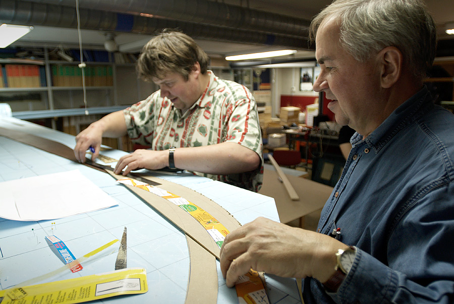 750 mm:n säteisiä mutkia varten leikattiin pahvista malline, jonka avulla voitiin vähän mallata, mihin kohti MDF-levyä laitetaan. Mallineen avulla saatiin myös sahattua oikeanlaiset levynpalaset mutkiin.
